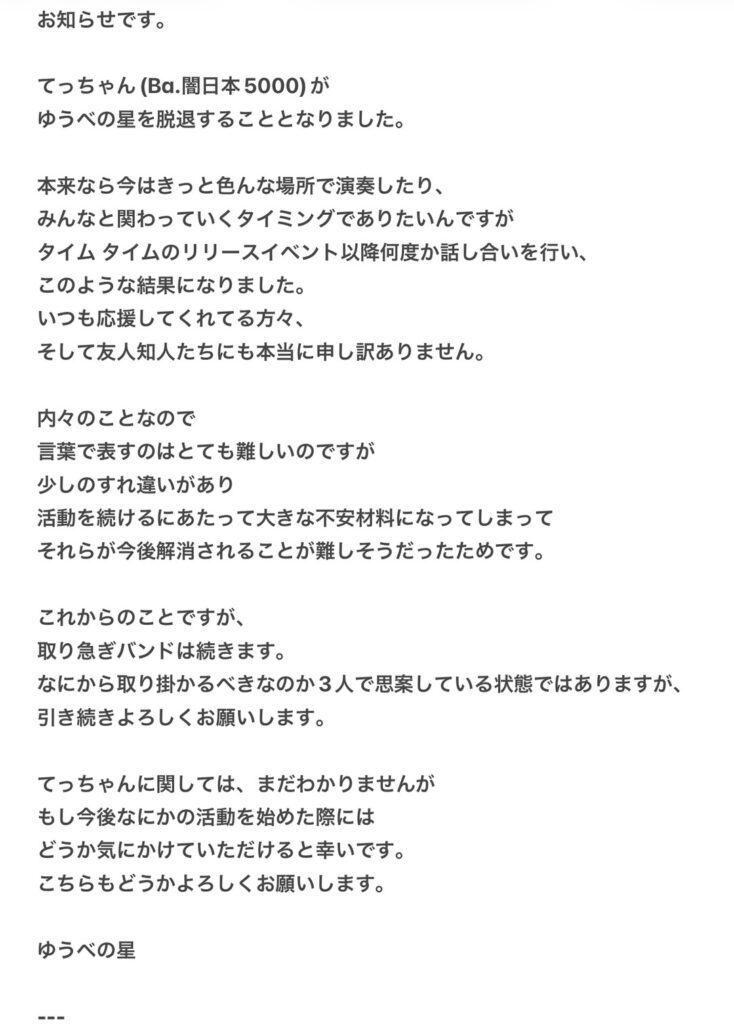 てっちゃんとは同じバンドではなくなるけれどもこれからも変わらず友達です。 てっちゃんの少しだけ変わる新しい生活を応援しています。 ゆうべの星は今後も続いていきますので、応援を頂けると幸いです。 よろしくお願いいたしま...